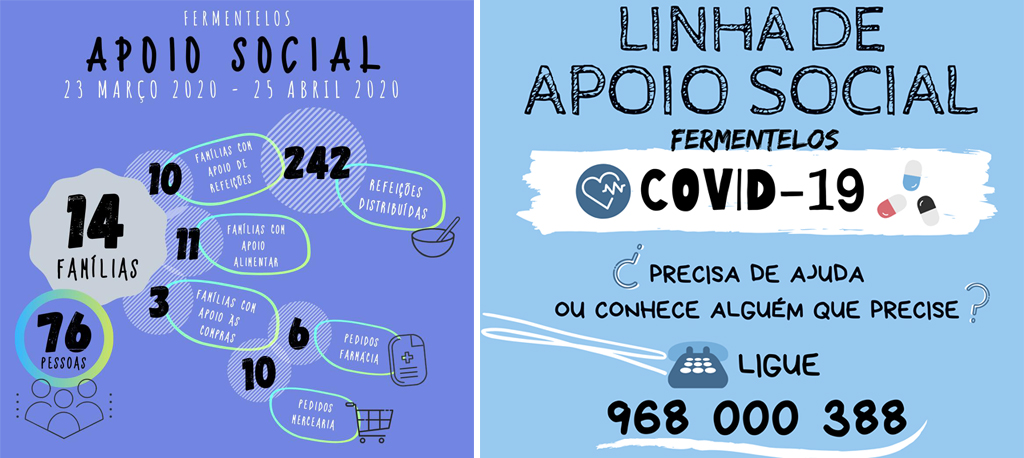 A Junta de Freguesia apela aos fermentelenses para o caso de identificarem alguma família ou pessoa que necessite de apoio, que contactem a Linha de Apoio Social através do número 968 000 388, entre as 9h e as 20h, todos os dias, ou através da página de Facebook, para que possa ser dado o devido encaminhamento e prestada a devida ajuda.