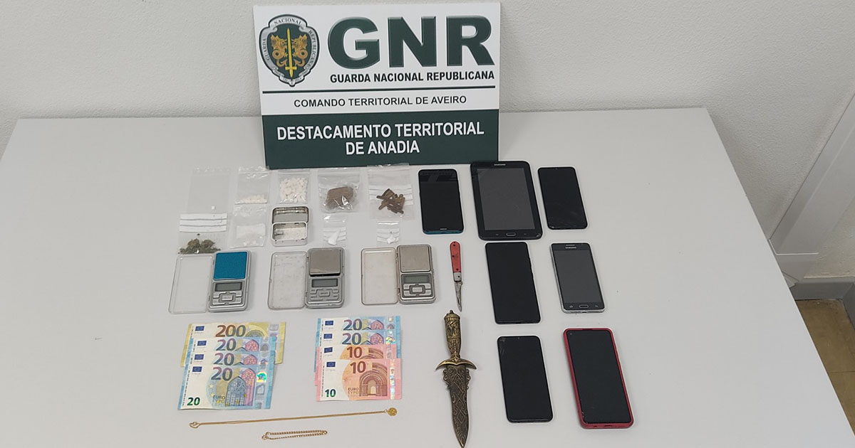 No decorrer das diligências de investigação, que contou com o reforço do Destacamento Territorial de Anadia e Águeda e do Destacamento de Intervenção (DI) de Aveiro, foram ainda apreendidas 90 doses de cocaína; 14 doses de haxixe; 320 euros em numerário; uma viatura ligeira de passageiros; um velocípede elétrico; três balanças; seis telemóveis; um tablet; um fio de ouro; uma pulseira de ouro; uma navalha de corte; um punhal e sacos de embalamento.
