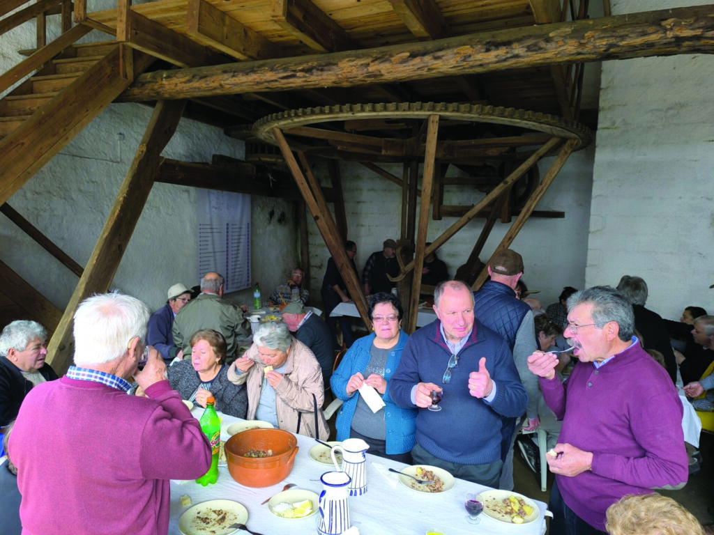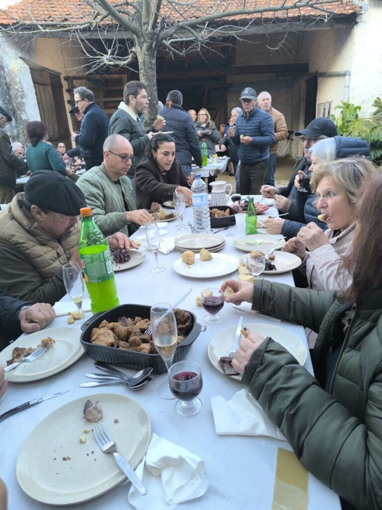 Durante o dia não faltaram os petiscos tradicionais, o pão caseiro, o vinho tinto da Bairrada e as especialidades preparadas no momento, tais como o sarrabulho, os ossos no vinho, os torresmos e as papas com ciscos e que reuniram todos à mesa em ambiente de grande alegria e amizade. Foi também um momento de recordar histórias antigas, fortalecer laços e celebrar a cultura rural que faz parte da identidade bairradina.