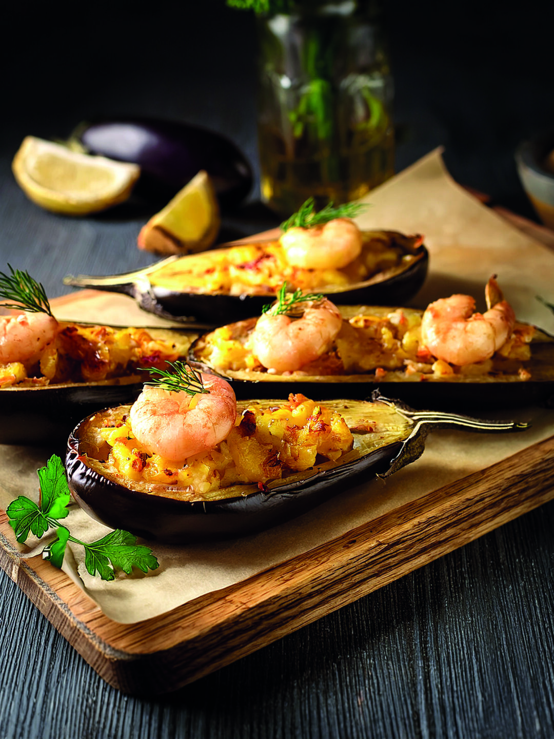 Entretanto, corte a polpa que retirou em pedaços pequenos e leve a corar no restante azeite, juntamente com o miolo de carão picado (reserve alguns para decoração). Adicione o ananás em cubos e os alhos picados. Tempere com sal, pimenta e piripiri e distribua pelas beringelas. Disponha por cima o miolo de camarão reservado e regue com a manteiga derretida. Leve ao forno por mais cinco minutos. No fim, polvilhe com a salsa picada.